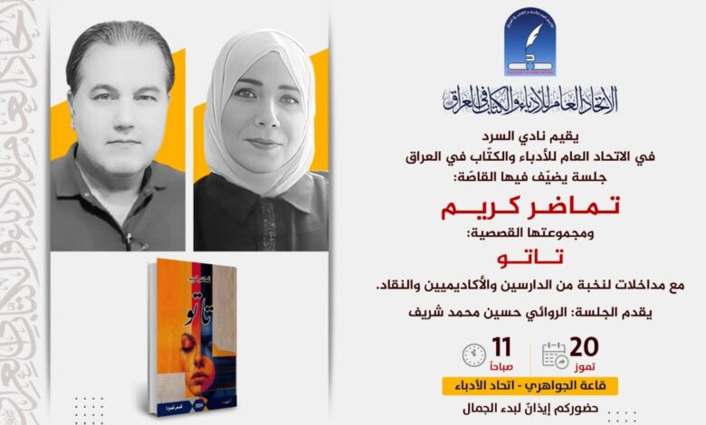 يقيم نادي السرد في الاتحاد العام للأدباء والكتّاب في العراق جلسة يضيّف فيها القاصّة (تماضر كريم) للحديث عن مجموعتها القصصية (تاتو)، مع مداخلات لنخبة من الدارسين والأكاديميين والنقاد ويقدم الجلسة الروائي حسين محمد شريف.