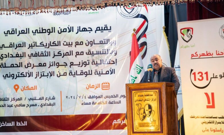 وقال المشرف العام عن هذه الفعالية، فنان الكاريكاتير غزال محمد في تصريح خصَّ به “المراقب العراقي”: “إيماناً منا باستثمار الطاقات الفذة ومشاركة المواهب الوطنية في إيصال الرسائل الإيجابية للمجتمع، لفرض التوعية من مخاطر العالم الافتراضي، واستكمالاً للحملة الأمنية التي أطلقها جهاز الأمن الوطني العراقي للوقاية من شِرك الابتزاز الإلكتروني والتي حملت أسم شعار (إحنه بظهركم)، انبثقت فكرة إقامة معرض لواحدة من أهم الأدوات الصحفية اختصاراً وأكثرها بلاغة (الكاريكاتير)، وتم تكليف “بيت الكاريكاتير العراقي” بإعلان مسابقة “كاريكاتير” دعماً للحملة الأمنية الوطنية بإشراف جهاز الأمن الوطني.