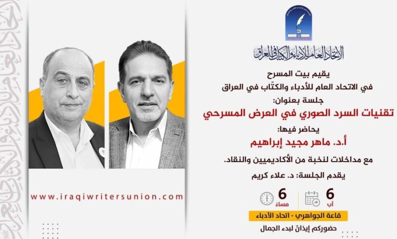 وقال رئيس بيت المسرح الدكتور علاء كريم الذي سيدير الجلسة في تصريح خصَّ به “المراقب العراقي”: إن “بيت المسرح في الاتحاد العام للأدباء والكتّاب في العراق سيقيم جلسة بعنوان (تقنيات السرد الصوري في العرض المسرحي) يحاضر فيها (أ. د. ماهر مجيد إبراهيم) مع مداخلات لنخبة من الأكاديميين والنقاد”.