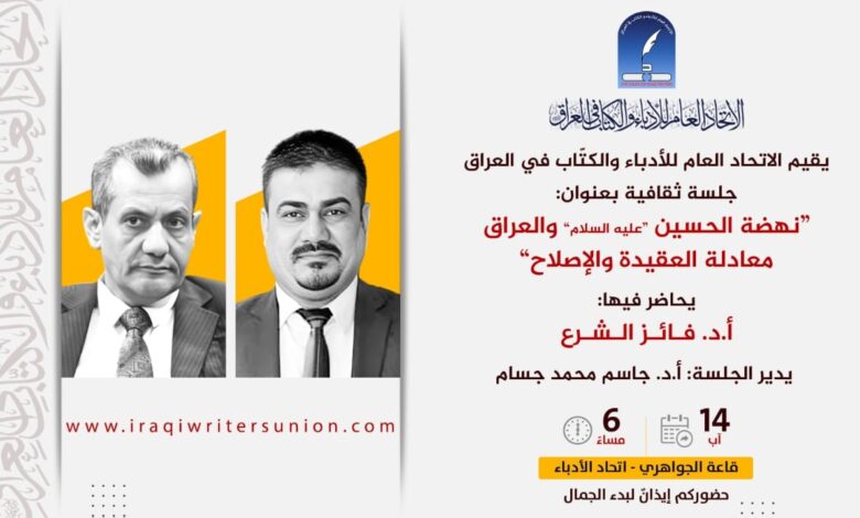 يقيم الاتحاد العام للأدباء والكتاب في العراق، جلسة ثقافية بعنوان (نهضة الحسين “عليه السلام” والعراق… معادلة العقيدة والإصلاح) يحاضر فيها (أ. د. فائز الشرع).
