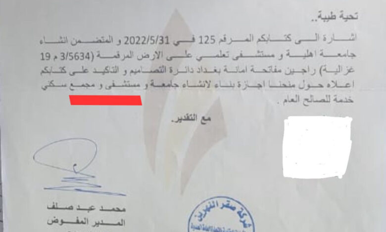 وأضاف أنه بعد كشف الموضوع من قبل رئيس النادي الجديد والذي تسلّم المنصب بتاريخ 20/5/2024، قام بإيقاف اجراءات تحويل كامل الأراضي الى شركة صقر النهرين، كما موضح بالكتب الموجهة الى أمانة بغداد.