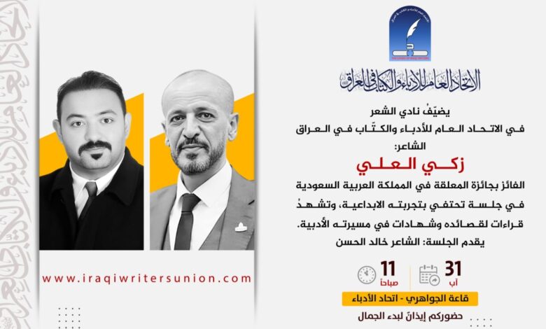 قرر نادي الشعر في الاتحاد العام للأدباءِ والكتّاب في العراق استضافة الشاعر زكي العلي في جلسة تحتفي بتجربته الإبداعية وذلك يوم السبت المقبل .