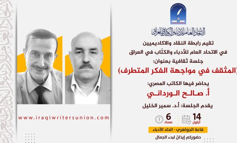 تقيم رابطة النقّاد والأكاديميين في الاتحاد العام للأدباء والكتّاب في العراق جلسة ثقافية بعنوان: (المثقف في مواجهة الفكر المتطرف) يحاضر فيها الكاتب المصري (أ. صالح الورداني) ويقدم الجلسة أ.د.سمير الخليل.