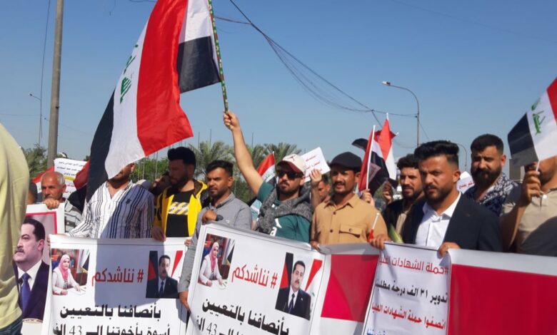 أكد متظاهرون من حملة الشهادات العليا والخريجين الأوائل ضمن الوجبة الثانية، إن الوجبة تشمل 22500 اسم، ظهرت أسماء 16 ألفاً منهم والمتبقي 6500 لم تظهر أسماؤهم وهو ما دفعهم الى التظاهر، أملاً في تحقيق مرادهم في الالتحاق بزملائهم الذين تم تعيينهم في دوائر الدولة.