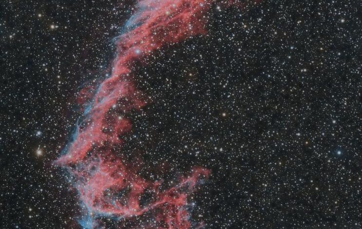 ويتابع: “طبعا تظهر الصورة سديم الحجاب الملتقط من خلال تلسكوبي باستخدام كاميرا فلكية أحادية اللون ومرشحات ذات نطاق ضيق، والتقاط الصورة استغرق أكثر من ٤ ساعات من إجمالي وقت التعرّض لإنشاء الصورة باستخدام فلتري هيدروجين وأوكسجين للغازات الخاصة به”.