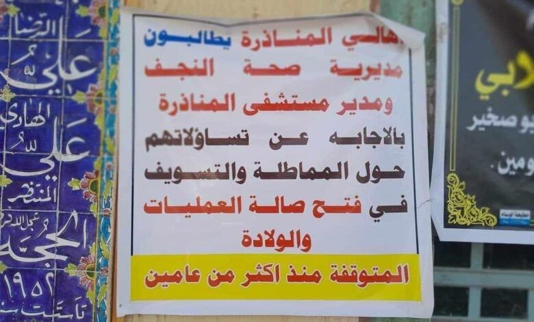 تسبب إغلاق صالات الولادة بأزمة في قضاء المناذرة، فقد تجمع أهالي قضاء المناذرة، جنوبي النجف، أمام المستشفى العام، احتجاجاً على استمرار إغلاق صالات العمليات والولادة لأكثر من عامين، مرددين شعارات غاضبة ضد إدارة المستشفى، تعبر عن استيائهم من عدم توضيح الأسباب الكامنة وراء إغلاقها.
