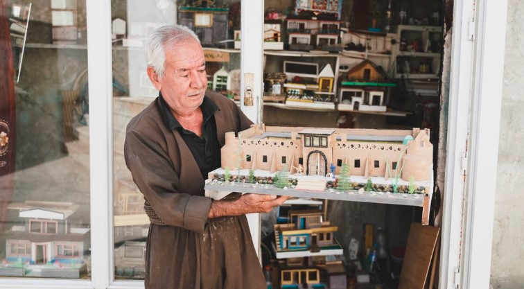 اعتاد السبعيني “جايوك عزيز، من مدينة كويسنجق في أربيل أن لا يبيع مجسماته الى الزبائن إلا بعد أن يسرد عليهم حكاية يخبئها بين زوايا تلك الأعمال.