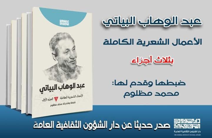 ضمن مبادرة رئيس الوزراء لدعم طباعة الكتاب وعن سلسلة ” شعر ” التي تصدرها دار الشؤون الثقافية العامة في وزارة الثقافة والسياحة والآثار صدرت حديثاً الأعمال الشعريّة الكاملة للشاعر عبد الوهاب البياتي بثلاثة أجزاء ضَبَط المقدمة وقدَّم للمجموعة: محمَّد مظلوم.