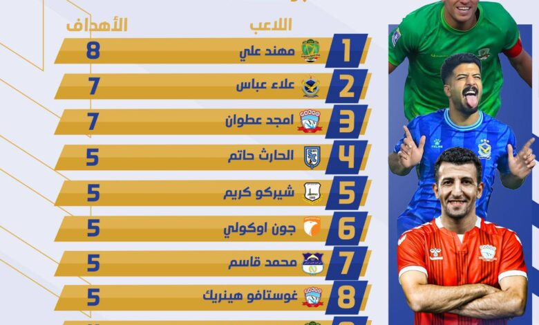 وتصدر (ميمي) قائمة الهدافين برصيد ثمانية أهداف، فيما حل لاعب القوة الجوية، علاء عباس في وصافة الترتيب بسبعة أهداف، وبنفس الرصيد حل أمجد عطوان لاعب نادي زاخو بالمركز الثالث، متقدماً على لاعب نادي القاسم، الحارث حاتم الذي حل رابعاً برصيد خمسة أهداف، فيما جاء لاعب أربيل، شيركو كريم بالترتيب الخامس بخمسة أهداف أيضاً، بينما حل محترف نادي الكرمة جون أوكولي سادساً بخمسة أهداف وبنفس الرصيد احتل لاعب النجف المركز السابع، وبأربعة أهداف احتل لاعب الشرطة لوكاس سانتوس المرتبة الثامنة تلاه لاعب دهوك، باشانك عبد الله تاسعاً وأخيراً لاعب الزوراء علي يوسف، في المرتبة العاشرة.