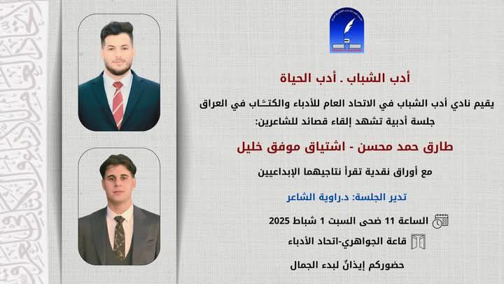 وقال الناطق الإعلامي لاتحاد الأدباء معن غالب سباح: إن “نادي أدب الشباب في الاتحاد العام للأدباء والكتـــَّــاب في العراق وضمن منهاجه للشهر المقبل، سيقيم جلسة أدبية تشهد إلقاء قصائد للشاعرين الشابين طارق حمد محسن – اشتياق موفق خليل، وهما من الأصوات الشعرية التي برزت خلال المدة الأخيرة، وكان لهما العديد من المشاركات الناجحة في أماسي ومهرجانات اتحاد الأدباء”.