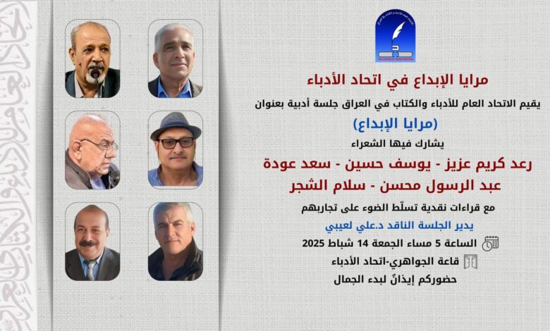 يقيم الاتحاد العام للأدباء والكتاب في العراق، جلسة أدبية بعنوان (مرايا الإبداع) يشارك فيها عدد من الشعراء الذين ينتمون الى أجيال شعرية متعددة مع قراءات نقدية تسلّط الضوء على تجاربهم.