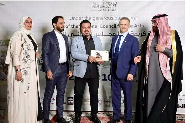 وفي ختام الفعالية، تم تكريمه بدرع المهرجان وشهادة شكر وتقدير، بالإضافة إلى تكريمه من قبل الجمعية البحرينية للفن المعاصر تقديرًا لمساهمته البارزة في هذا المحفل الفني الدولي.