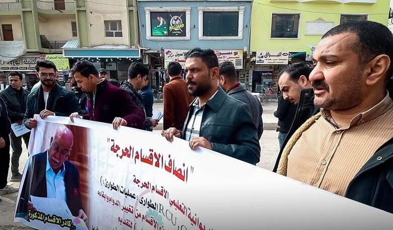 ونظمت الملاكات الصحية التمريضية في مستشفى الديوانية التعليمي، اليوم الثلاثاء، تظاهرة أمام دائرة صحة الديوانية، للأقسام الحرجة (الإدارة الليلية، HDU، CCU، RCU، الطوارئ وعمليات الطوارئ)، وقفة احتجاجية أمام صحة المحافظة، احتجاجا على تغيير أوقات عملهم ودوامهم.