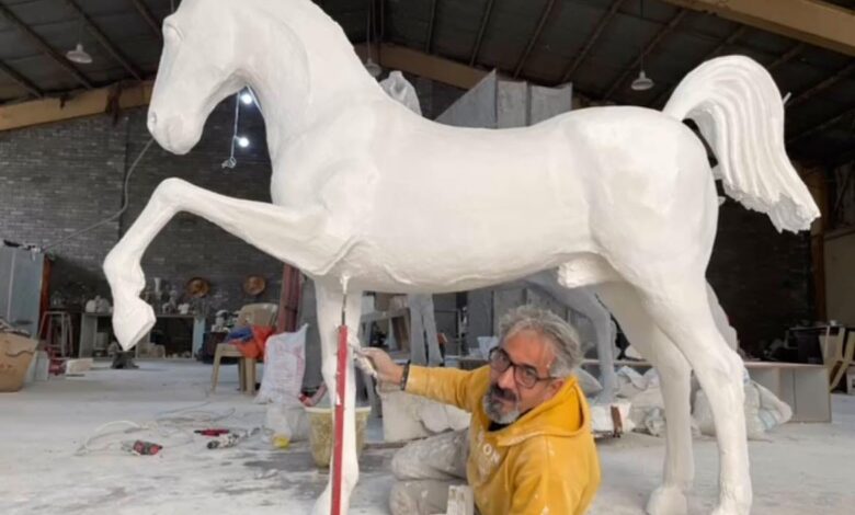 وأكمل :”في عمل أخير يعمل عليه ويمثل له نوعا من التفوق على صعيد الإنجاز ، يعمل حلبجي على أنجاز منحوتة لحصان بالحجم الطبيعي من حجر الرخام الابيض ، متحديا فيه قدراته الادائية التي اختبرها جيدا في اعمال اخرى عديدة ، وهو ينطلق من رؤيا أتته في المنام اذا أسرَّني بالقول : إن نسبي يعود للإمام الحسين ( ع ) ، في المنام أتتني رؤيا تتمثل بحصان ابيض ، وعلى ظهره كائن وكأنه شعلة من نور وقال لي بصوت واثق عليك بنحت حصان ابيض ، والمجيء به إلى كربلاء حيث ضريحي”.ولست هنا بمعرض تفسيري الشخصي للحلم على ضوء نظريات علم النفس الحديث ، ولا شكوك لدي فيما يقول ، لأن القضية تتعلق بإيمان الفنان ومتبنياته ومرجعياته الحالية ، لكن ما يعمل عليه يمثل إنجازا كبيرا يضاف الى سلسلة منجزاته النحتية الفذة”.