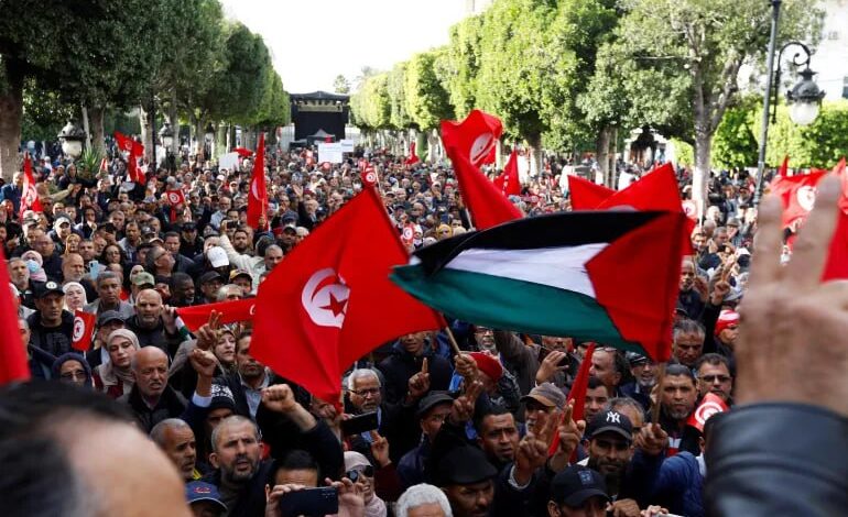 تظاهر المئات من التونسيين، اليوم الأحد، للمطالبة بطرد السفير الأمريكي بالتزامن مع حرب الإبادة التي يشنها الكيان الصهيوني على فلسطين.