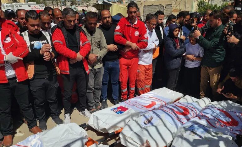 وفي 23 آذار الماضي، قتل 15 مسعفاً وعاملاً إنسانياً بنيران صهيونية في رفح، وزعم الجيش “الإسرائيلي” أنه رصد اقتراب مركبات بصورة مريبة من دون قيامها بتشغيل أضواء أو إشارات الطوارئ، مما دفع قواته لإطلاق الرصاص نحوها.
