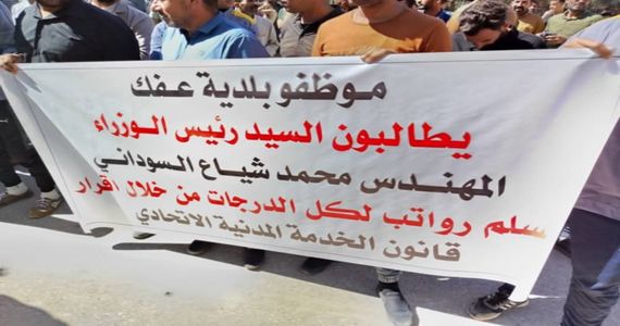 تظاهر العشرات من موظفي بلدية قضاء عفك أمام مبنى بلديات محافظة الديوانية، لمطالبة الحكومة المركزية والمحلية بزيادة رواتبهم ومخصصاتهم المالية التي مازالت تحت المستوى المطلوب.
