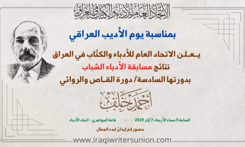 يعلن الاتحاد العام للأدباء والكتّاب في العراق، غدا الأربعاء، عن نتائج مسابقة الأدباء الشباب، بدورتها السادسة – دورة القاص والروائي أحمد خلف بمناسبة يوم الأديب العراقي.