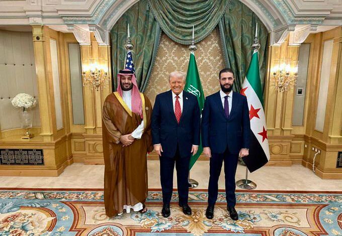 والتقى الرئيس الأمريكي نظيره في الحكومة الانتقالية السورية “الجولاني” في العاصمة السعودية الرياض، بعد يوم واحد فقط من إعلان رفع العقوبات الأمريكية المفروضة على دمشق.