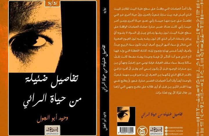 وتابع أن” رواية تفاصيل ضئيلة من حياة الرائي عبارة عن أجزاء بسيطة مما حصدته،في حياتي من خسارات وأرباح وسرت بمحاذاته داخل ذهني وخارجه، الخارج الذي يحمل بعض الغرائب التي تصادف نبوغ العين الواهمة”.