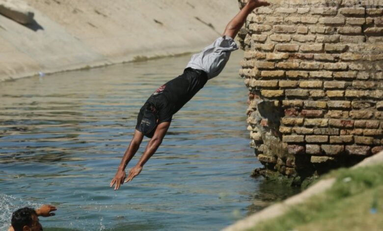نتيجة للانقطاع المستمر للكهرباء، وفي ظل ارتفاع درجات الحرارة التي بدأت تلامس الخمسين درجة مئوية، يتخذ الشباب من نهر الحسينية في محافظة كربلاء، ملاذاً لينقذهم من لهيب الصيف الساخن.