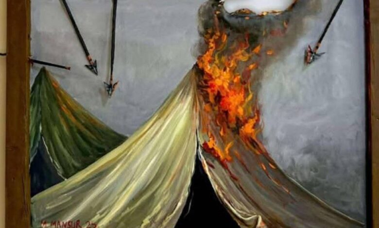 ويدرك الفنان مرتضى منصور “27 عاما” من محافظة بابل : أهمية الدور الاجتماعي الذي تمارسه الريشة والألوان في صياغة الفكرة والتعبير عنها، كما يدرك أنها تعجز أحيانا عن الوصول إلى غاياتها فتستعين بعوامل أخرى، فينتج هنا “فن الوسائط المتعددة” أو “الفن المفاهيمي”، وهو ما عبر عنه في لوحة تجسد واقعة الطف ومظلومية الحسين “عليه السلام”