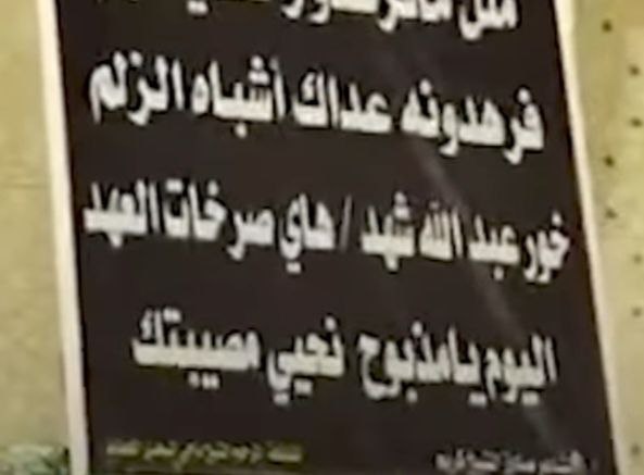 فقد رفع مئات الزائرين لمرقد الإمام الكاظم “عليه السلام”، لافتات خلال مسيرة جابت الصحن الخارجي للمرقد، جددوا من خلالها المطالبة بعراقية خور عبد الله، حيث حملت إحدى اللافتات شعاراً، “مثلما فرهدوا رحلك يا حسين.. فرهدونة عداك أشباه الزلم.. خور عبد الله شهد هاي صرخات العهد.. اليوم يا مذبوح نحيي مصيبتك”.