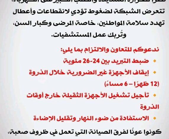 ودعت المواطنين حسب البيان لـ”التعاون والالتزام بضبط التبريد بين 24-26 مئوية، إضافة الى إيقاف الأجهزة غير الضرورية خلال الذروة (12) ظهرًا – 6 مساءً)، فضلا عن تأجيل تشغيل الأجهزة الثقيلة خارج أوقات الذروة، والاستفادة من ضوء النهار، وتقليل الإضاءة”.