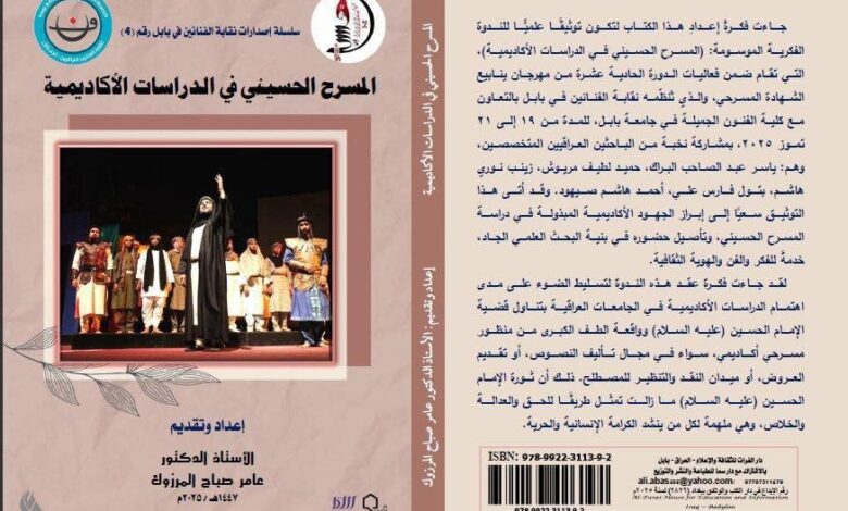 وأضاف: أن “هذا الكتاب هو توثيق يسعى إلى إبراز الجهود الأكاديمية المبذولة في دراسة المسرح الحسيني، وتأصيل حضوره في بنية البحث العلمي الجاد، خدمةً للفكر والفن والهوية الثقافية”.