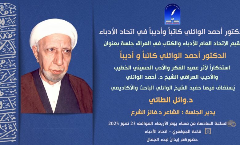 وقال الامين العام لاتحاد الادباء عمر السراي في تصريح خص به “المراقب العراقي “: إن” اتحاد الادباء سيقيم جلسة بعنوان :الدكتور أحمد الوائلي ،، كاتباً وأديبا والتي ستكون استذكاراً لأثر عميد الفكر والأدب الحسيني الخطيب والأديب العراقي الشيخ د. أحمد الوائلي”يُستضاف فيها حفيد الشيخ الوائلي ؛ الباحث والأكاديمي د. وائل الطائي ويديرها الشاعر د. فائز الشرع”.