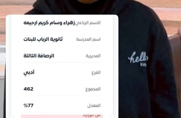 حيث نجحت زهراء من الدور الأول وحققت معدل 77% في الصف السادس الأدبي لتثبت أن الإرادة تصنع المعجزات.