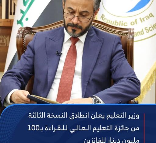 كشف وزير التعليم العالي والبحث العلمي الدكتور نعيم العبودي عن انطلاق النسخة الثالثة من جائزة التعليم العالي للقراءة الموجهة إلى طلبة الدراسات الأولية والعليا والطلبة الدوليين الدارسين في الجامعات العراقية.