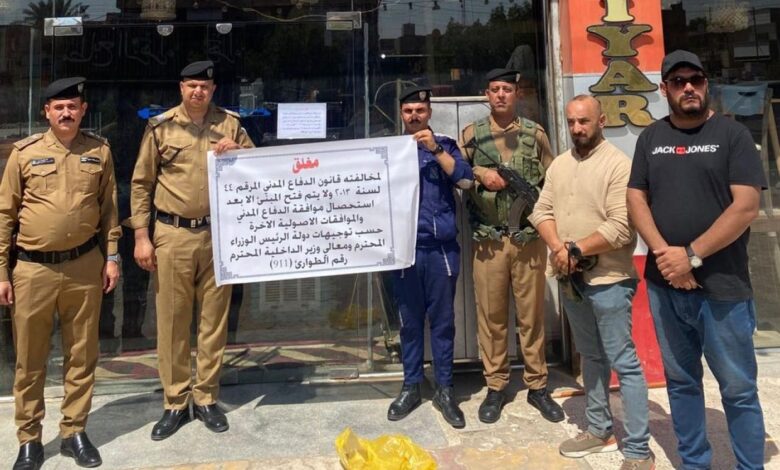 أعلنت قيادة عمليات بغداد، إغلاق بناية سكنية وعدد من المشاريع التجارية والمخازن لمخالفتها شروط السلامة والأمن وذلك ضمن مناطق (النهروان، جرف النداف، الكرادة) بجانب الرصافة، وجاءت الإغلاقات بالتزامن مع ارتفاع درجات الحرارة وللحفاظ على حياة المواطنين والممتلكات العامة والخاصة، وتم توجيه دعوة لأصحاب المخازن والمحال التجارية والبنايات السكنية الى “الالتزام بتعليمات مديرية الدفاع المدني وإجراءات السلامة والامن تجنباً لحدوث الحرائق وتعرضهم للمساءلة القانونية”.