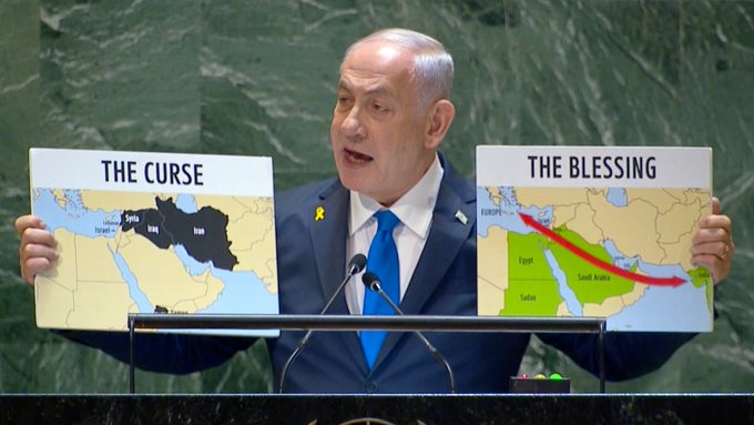 بعينين تلتمعان ببريق بدا أشبه بفرح غريزي، رفع بنيامين نتنياهو خريطة “إسرائيل الكبرى” أمام العالم من على منبر الأمم المتحدة، كما لو أنه يُعلن بداية عصرٍ تتحوّل فيه الأسطورة التوراتية إلى واقع سياسي لا يقبل المساومة، لكن ما يجب أن يُقلق كلّ مراقب ليس هذا المشهد وحده، بل حقيقة أنّ نتنياهو ظلّ على امتداد ربع قرن من العمل السياسي، يُعيد التأكيد -تصريحاً وتلميحاً- إيمانه العميق بمشروع “إسرائيل الكبرى” الممتدة “من النيل إلى الفرات”. رفعُ الخريطة إذاً لم يكن سوى الجزء الظاهر من جبل الثلج، تجسيد بصري متأخّر لمعتقدٍ راسخ ظلّ يتقدّم خطوة بعد أخرى، من قاموس التوراة إلى خرائط العدوان والتمدّد.