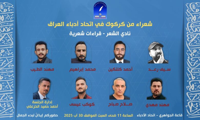يضيّف نادي الشعر في الاتحاد العام للأدباء والكتاب في العراق، يوم السبت المقبل، عدداً من شعراء كركوك، بجلسة تتضمن قراءات شعرية متنوعة، وهي في إطار جلسات خصصت للاحتفاء بمبدعي المحافظات.