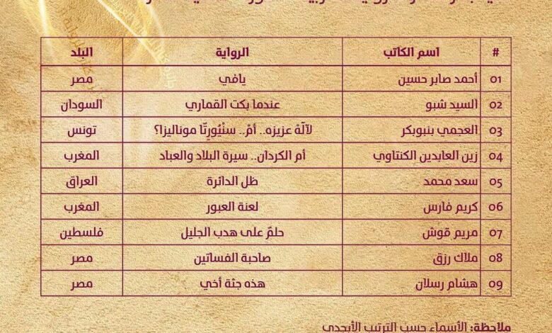 وأضاف إن” الروايات التي وصلت الى القائمة القصيرة هي “يافي” لأحمد صابر حسين، و”عندما بكت القماري” للسيد شبو، و”الآلة عزيزة” للعجمي بنبوبكر، و”أم الكردان” لزين العابدين الكنتاوي، ، و”لعنة العبور” لكريم فارس، إلى جانب “حُلم على هدب الجليل” لمريم قوش، و”صاحبة الفساتين” لملك رزق، و”هذه جثة أخي” لهشام رسلان بالإضافة الى روايتي “ظل الدائرة” التي اتمنى أن تنال الجائزة وهو طموح مشروع لا سيما أني استغرقت في كتابتها أكثر من ثلاث سنوات قبل الدفع بها الى المشاركة في المسابقة”.