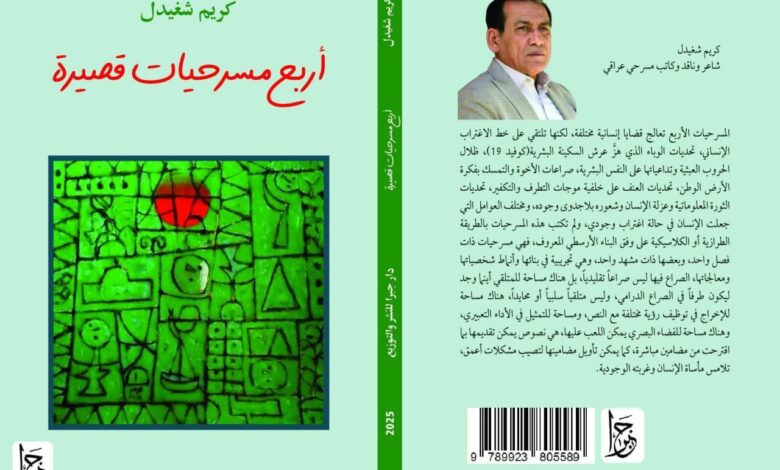 صدر عن دار جبرا للنشر والتوزيع كتاب في الإبداع المسرحي بعنوان أربع مسرحيات قصيرة لكاتبه الشاعر والناقد والكاتب المسرحي العراقي الدكتور كريم شغيدل وهو كتابه الأول في المسرح بعد طول انشغال عنه بالشعر والكتابة النقدية.