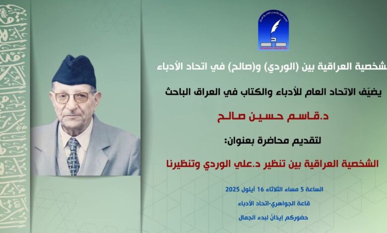 يقيم الاتحاد العام للأدباء والكتّاب في العراق جلسة عن الشخصية العراقية بين (الوردي) وقاسم حسين (صالح) في قاعة الجواهري.
