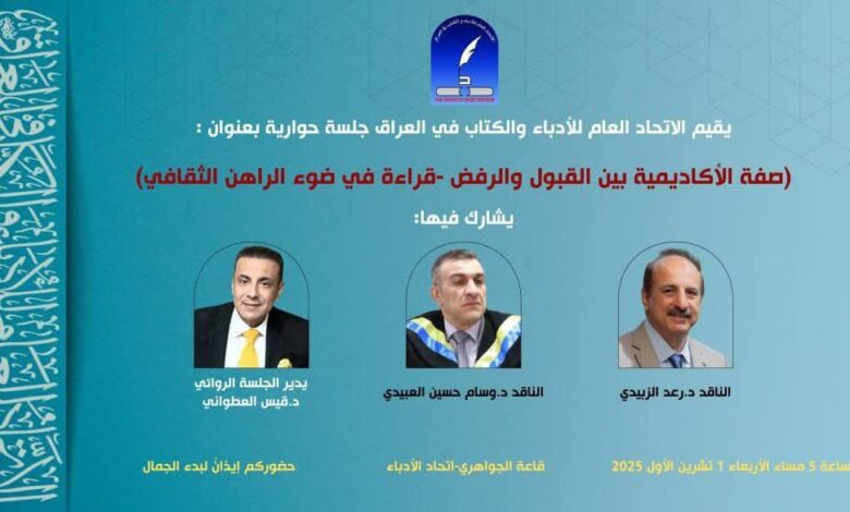 يقيم الاتحاد العام للأدباء والكتاب في العراق جلسة حوارية بعنوان (صفة الأكاديمية بين القبول والرفض -قراءة في ضوء الراهن الثقافي) يشارك فيها الناقد الدكتور رعد الزبيدي والناقد أ.د. وسام حسين العبيدي.