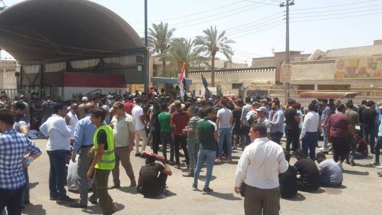 وأكد أن “المتظاهرين كعادتهم في كل يوم يقفون أمام بوابة شركة مصافي الجنوب ويحاولون منع الموظفين من العبور إلى الشركة في محاولة للضغط على المسؤولين، واليوم فتحت البوابة بالقوة من قبل القوات الأمنية وأصيب عدد من المتظاهرين بضربات مباشرة”.