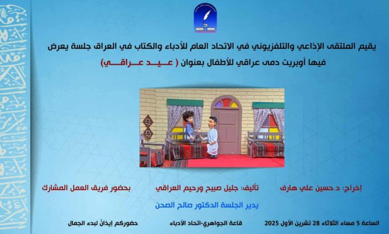 وقال الناطق الإعلامي لاتحاد الأدباء معن غالب سباح في تصريح خص به “المراقب العراقي”: ان “الملتقى الإذاعي والتلفزيوني في الاتحاد العام للأدباء والكتاب في العراق وضمن موسمه الثقافي للشهر الحالي، سيقيم جلسة يعرض فيها أوبريت دمى عراقي للأطفال بعنوان (عيد عراقي) وهو من إخراج، د. حسين علي هارف، وتأليف جليل صبيح ورحيم العراقي، بحضور فريق العمل المشارك”.