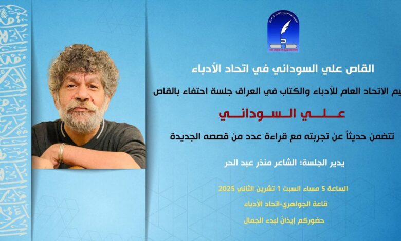 يقيم الاتحاد العام للأدباء والكتاب في العراق، جلسة احتفاء بالقاص علي السوداني تتضمن، حديثاً عن تجربته القصصية في الغربة، مع قراءة عدد من قصصه الجديدة في الساعة الخامسة من مساء السبت، الأول من تشرين الثاني على قاعة الجواهري في اتحاد الأدباء، وسيدير الجلسة الشاعر منذر عبد الحر.