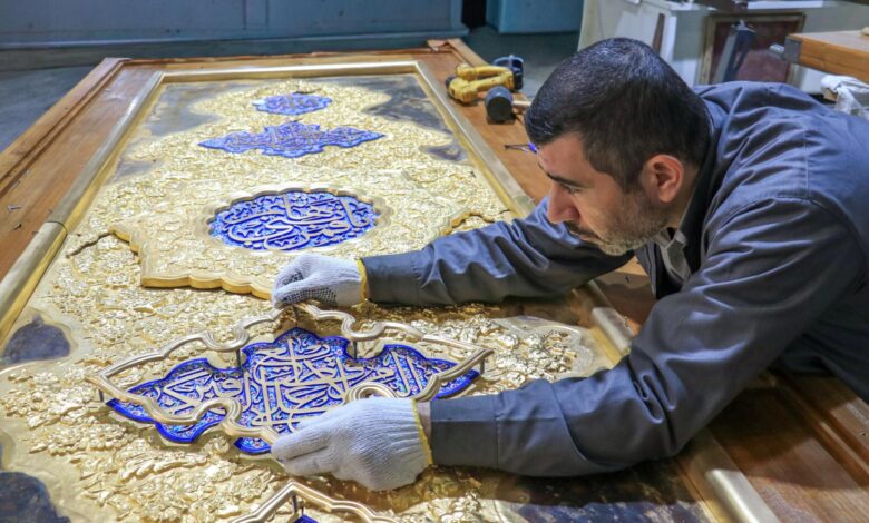 وشملت الأعمال أيضاً تركيب الأجزاء الكتابية والقطع المعدنية المحاطة بالباب الخشبي، بعد تلوينها بالمينا الزجاجية وتذهيبها بما ينسجم مع قدسية المكان ورمزيته.