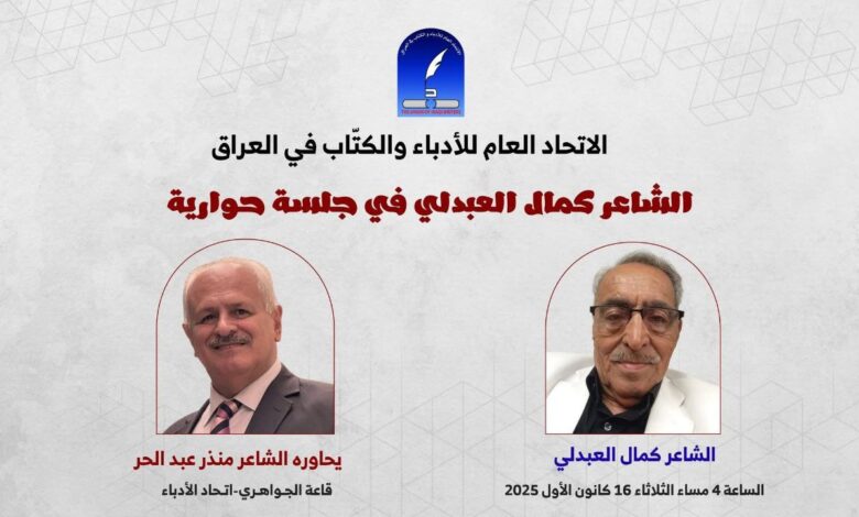 يقيم الاتحاد العام للأدباء والكتاب في العراق جلسة حوارية للشاعر كمال العبدلي تتضمن الجلسة شهادات يقدمها عدد من الأدباء والنقاد ويديرها الشاعر منذر عبد الحر.