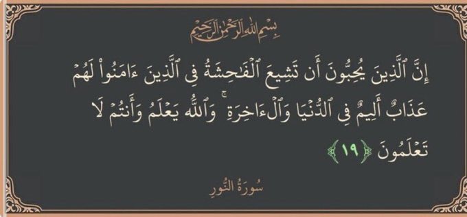 إن الآية ١٩ في القرآن الكريم، بسورة النور لم تقل: (الّذين يشيعون الفاحشة)، بل قالت: ﴿إِنَّ الَّذِينَ يُحِبُّونَ أَن تَشِيعَ الْفَاحِشَةُ…﴾، ثمّ قرنت بالتذكير بسعة علمه تعالى. فهو “يعلم الّذين يبيّتون في قلوبهم حبّ هذا الذنب، ويعلم الّذين يمارسونه تحت واجهات خدّاعة، أمّا أنتم فلا تعلمون ذلك ولا تدركونه”.