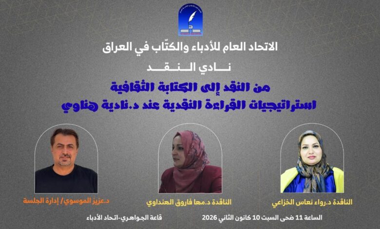 يقيم نادي النقد في الاتحاد العام للأدباء والكتاب في العراق جلسة بعنوان (من النقد إلى الكتابة الثقافية/ استراتيجيات القراءة النقدية عند د. نادية هناوي).