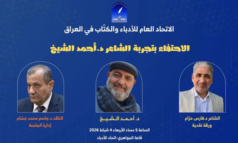 يحتفي الاتحاد العام للأدباء والكتاب في العراق بتجربة الشاعر د. أحمد الشيخ علي، في جلسة تتضمّن قراءات شعرية له، مع ورقة نقدية يقدّمها الشاعر د. فارس حرّام.