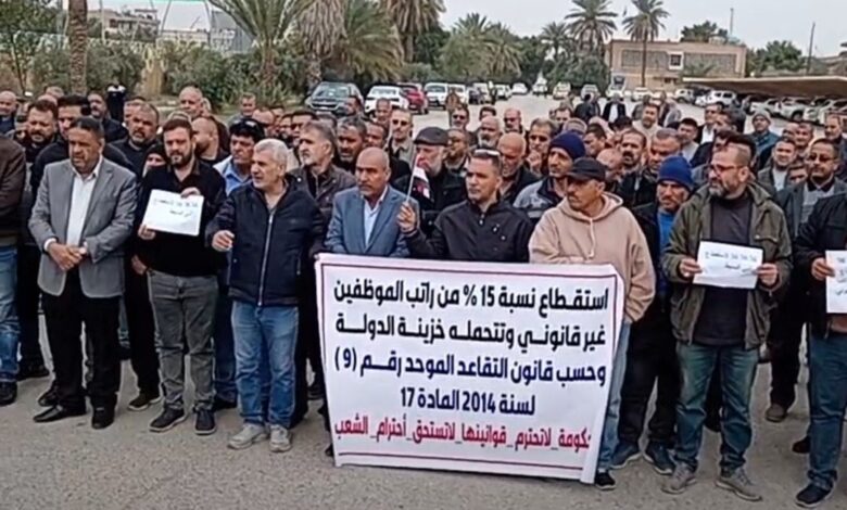 وقال محمد حسين أحد المحتجين: ان “استقطاع نسبة 15% من رواتبنا من قبل وزارة المالية، يعد مخالفة لقانون التقاعد الموحد رقم 9 لسنة 2014 المادة 17″، مضيفا، “نطالب لجنة النزاهة البرلمانية ومجلس القضاء الأعلى بالتدقيق في قانون قيام وزارة المالية بإسقاط نسبة 15% من راتب منتسبي مصنع نسيج وحياكة واسط بدون سند قانوني، وسنستمر بالاحتجاج إلى حين تحقيق مطلبنا وإعادة النسبة المستقطعة من رواتبنا”.