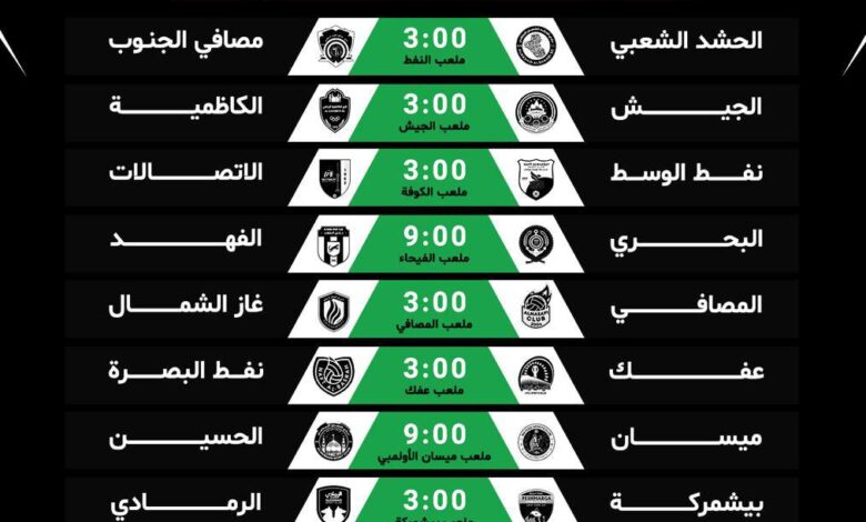 وتشهد الجولة عدة مواجهات، إذ يلتقي فريق الحشد الشعبي مع ضيفه مصافي الجنوب على ملعب نادي النفط، بينما يستضيف الجيش فريق الكاظمية على ملعبه، ويواجه نفط الوسط ضيفه الاتصالات على ملعب الكوفة، في حين يلاقي البحري ضيفه الفهد على ملعب الفيحاء، ويلاقي المصافي ضيفه غاز الشمال على ملعب المصافي.