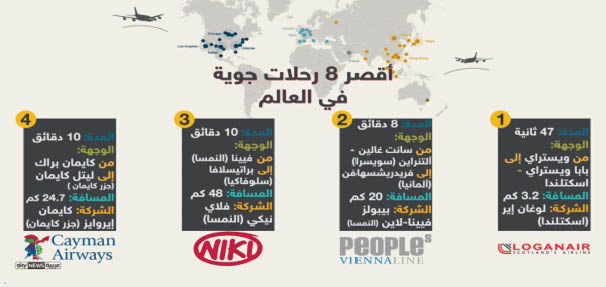 غالبا ما نسمع أن طائرة تابعة لإحدى شركات الطيران قامت بأطول رحلة جوية، بل وحطمت رقما قياسيا عالميا من حيث طول الرحلة، وهو ما فعلته على سبيل المثال شركة طيران “إير إنديا” عندما قامت برحلة بين دلهي وسان فرانسيسكو وبلغ طولها 9400 ميل أي ما يعادل 15 ألف كيلومتر. ولكن من النادر أن يتم تسجيل أقصر الرحلات الجوية من حيث التوقيت، خصوصا إذا كانت رحلة دولية، أي بين مطارين في دولتين، وليس رحلة داخلية. في الثاني من تشرين الثاني الجاري، قامت شركة طيران نمساوية بتسجيل رقم قياسي بأقصر رحلة جوية دولية، وذلك عندما قامت طائرة تابعة لشركة الخطوط الجوية النمساوية “بيبولز فيينا-لاين” برحلة بين مطار سانت غالين-ألتنراين في كانتون سانت غالين السويسري ومطار مدينة فريدريشسهافن الألمانية، واستغرقت 8 دقائق فقط.وتبلغ المسافة بين المدينتين، الواقعتين على سواحل بحيرة كونستانس أو بودنسي التي تحيط بها 3 دول أوروبية هي ألمانيا والنمسا وسويسرا نحو 20 كيلومترا.وتصدرت هذه الرحلة القصيرة قائمة الرحلات الدولية الأقصر في العالم، لكنها لم تتصدر قائمة أقصر الرحلات الجوية سواء المحلية أو الدولية، التي تتصدرها رحلة الطيران الاسكتلندية التي تقوم بها شركة لوغان إير الاسكتلندية بين جزيرتي ويستراي وبابا ويستراي في شمال البلاد وتبعدان عن بعضهما مسافة 3.2 كيلومترات، وتستغرق 47 ثانية فقط، لكنها قد تطول لتستغرق دقيقتين في حال وجود طقس عاصف أو رياح شديدة.
